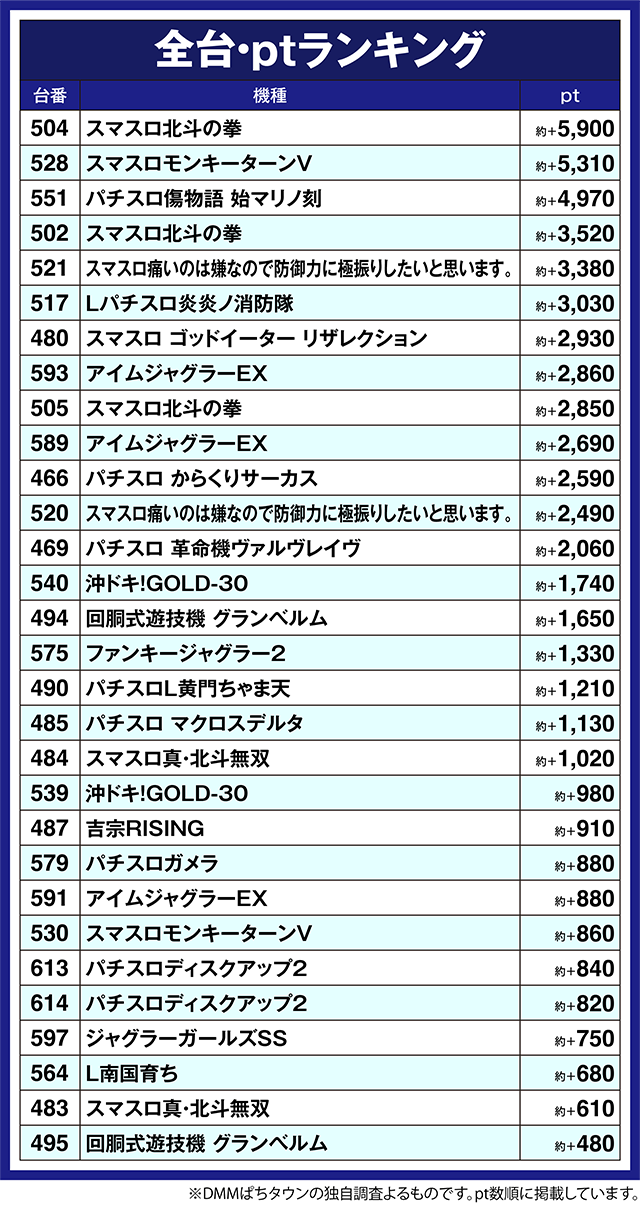 ほかにも、「Lパチスロ炎炎ノ消防隊」の517番台は約+3,030pt、「スマスロ ゴッドイーター リザレクション」の480番台は約+2,930ptと、多くの台が結果を残した。