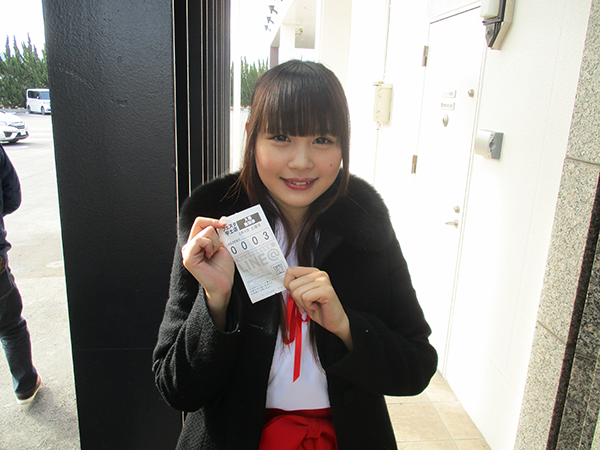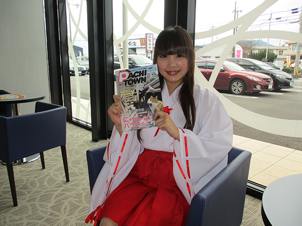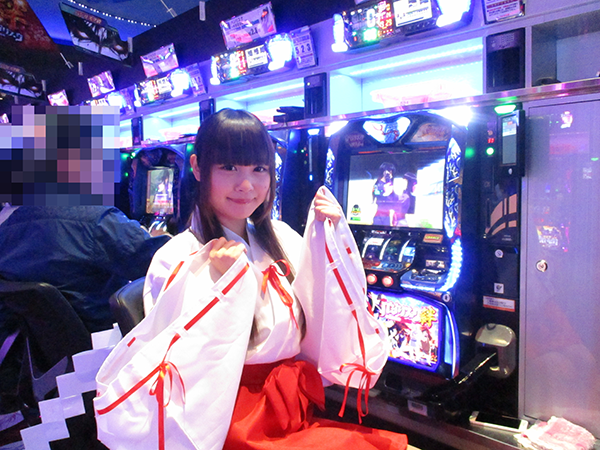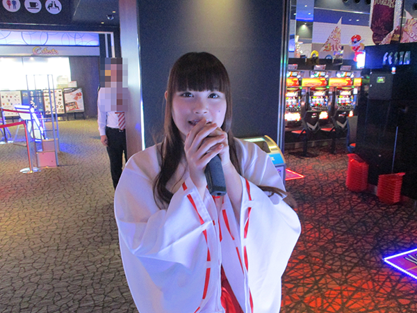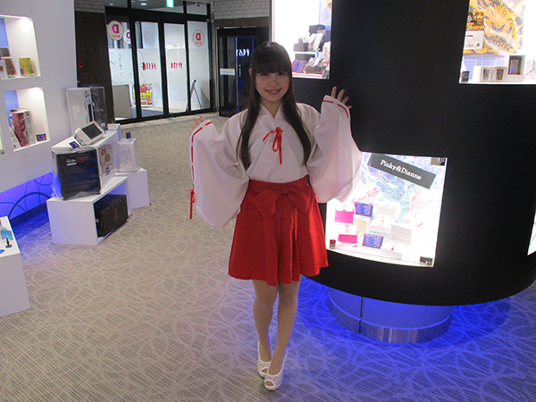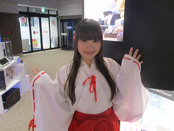 巫女さん風コスチュームに着替えて、まずはお客さまにご挨拶。