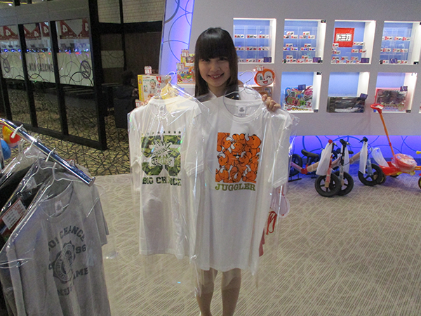 洗剤などの日用品から、パチンコやパチスロのキャラクター商品まで…多種多様に取り揃えられていました♪ ももちゃんはジャグラーシリーズのTシャツが気に入ったみたい❤