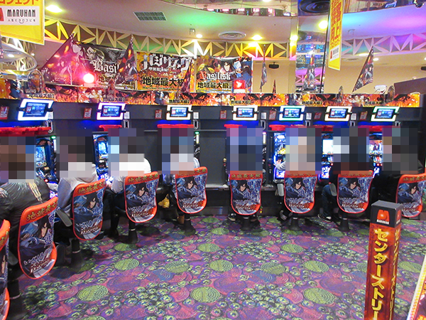 14時頃の21.27円パチスロでは、「バジリスク~甲賀忍法帖~絆」が大盛り上がり。機種の醍醐味を堪能しているような姿が多く、各シマに魅力的な光景が広がっていた。