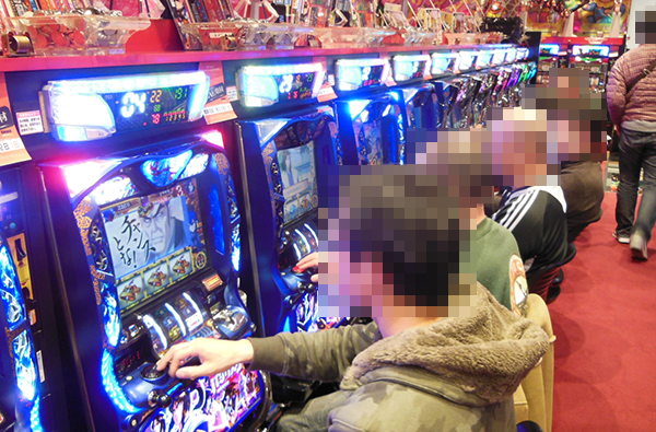 15時頃の20円パチスロにおいて、とくに活気づいていたのは「バジリスク~甲賀忍法帖~絆」。満席となっているだけでなく、機種の性能を引き出しているようなプレイヤーが多かったことも印象的であった。