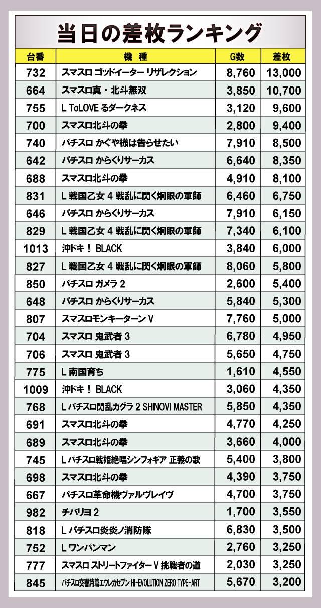 『スマスロ ゴッドイーター リザレクション』『スマスロ真・北斗無双』から+万枚OVERが発生しており、ホール内の盛り上がりをリードしていた。また『L ToLOVEるダークネス』『スマスロ北斗の拳』では+9,000枚OVER、『パチスロ かぐや様は告らせたい』『パチスロ からくりサーカス』『スマスロ北斗の拳』は+8,000枚OVERと各コーナーで熱気にあふれる台を発見することができた。