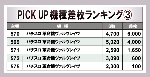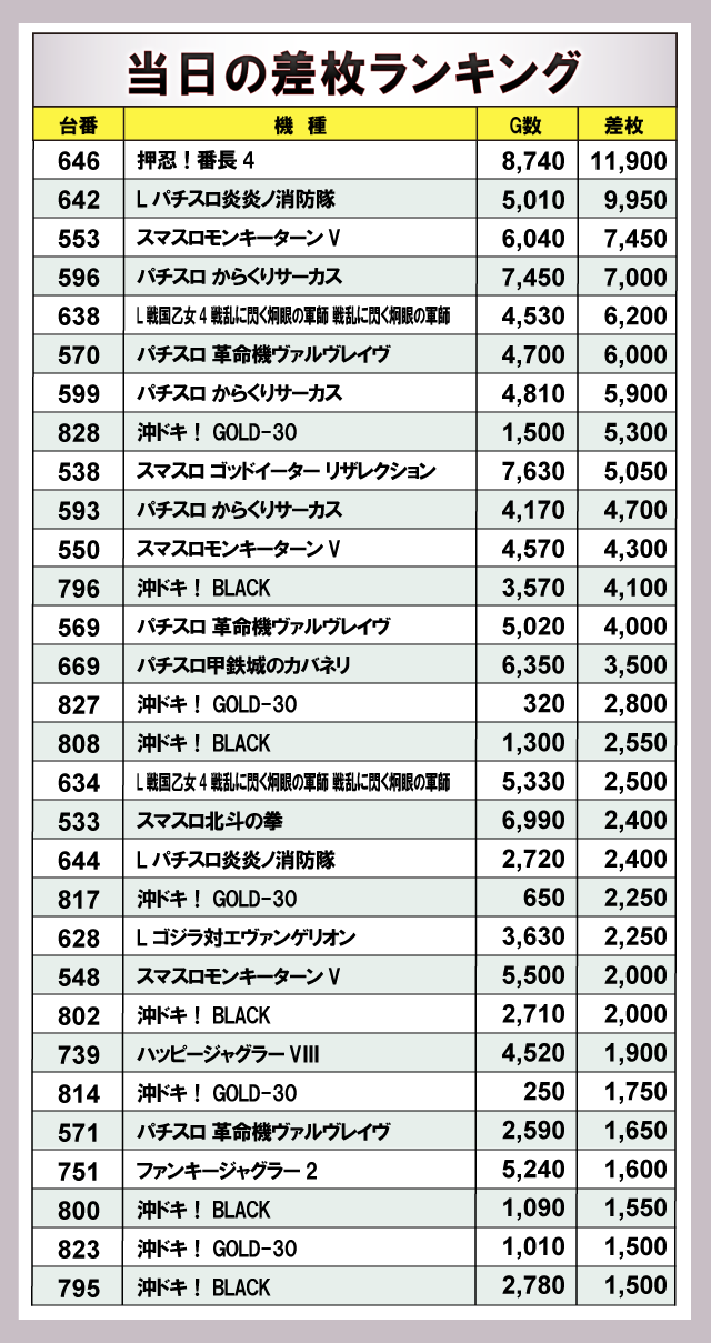 上表に取り上げた3機種は、いずれも店内に熱気を形成した機種と言える。上記に上げた通り『パチスロ からくりサーカス』『沖ドキ!GOLD-30』『パチスロ 革命機ヴァルヴレイヴ』から大台突破台が生まれているわけだが、特筆すべきはどの機種も4桁差枚を放出している所だ。いずれも打ちごたえのある状況が整っていた様子から、ファンにとって叩き甲斐があったと言えるだろう。