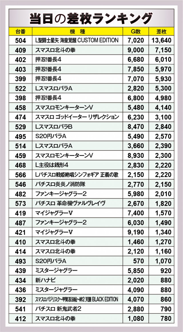 『L聖闘士星矢 海皇覚醒 CUSTOM EDITION』から万枚OVERが発生し、大きな熱気が店内に放たれていた。そして『スマスロ北斗の拳』『押忍!番長4』と大台突破台が数多く飛び出し、ファンは有意義な時間を過ごしていたことだろう。それは回転数にも表れており、朝から閉店までじっくりと打ち込まれた台が多いことから、可能性を感じ取っていたのは間違いない。