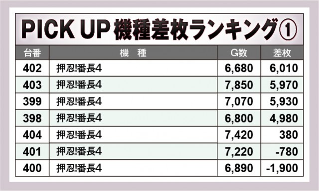 『押忍!番長4』は半数以上がプラス差枚数を記録しており、ほとんどが大台突破台となっている。5~6,000枚というまとまった出玉を獲得したファンは、回転数が示しているように、同機種にポテンシャルを感じ取っていたことだろう。また大きなマイナスも目立っていないため、全台が相当な可能性を持っていたとも読めることから、力強くレバーを叩けていたはずだ。