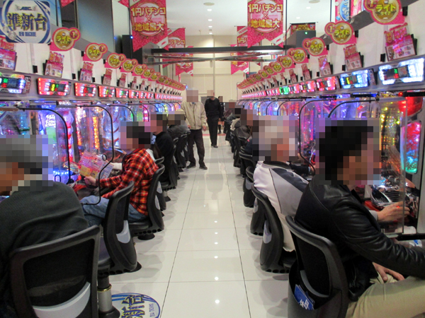 若者から年配まで幅広い年代のプレイヤーが見られた1円パチンコは和やかな雰囲気。とは言え、空台はほとんどない状況であった。1円パチンコでは各台の上にスペックカテゴリが書かれたPOPが表示されていて分かりやすいと感じた。