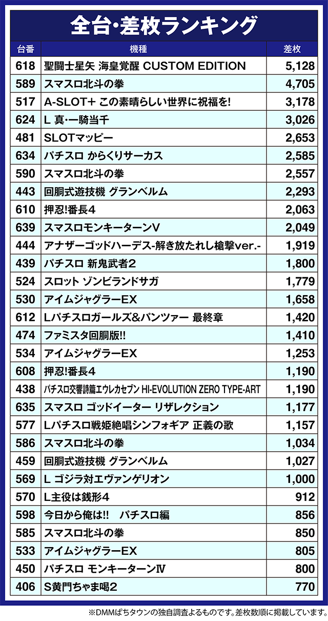 ほかにも、「パチスロ からくりサーカス」の634番台や「押忍!番長4」の610番台などが2,000ptを超えた。