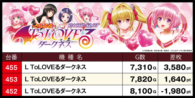 次に、優秀機種別ランキングチェックしてみると、『スマスロ北斗の拳』からは+4,000枚超が2台、『L ToLOVEるダークネス』は+3,000枚超が出現。