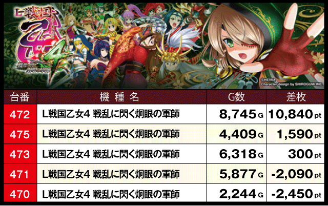 さらにランキングトップになった『L戦国乙女4 戦乱に閃く炯眼の軍師』は半数以上の台がプラスで終了する好成績を残しているだけに、ファンにとっては大満足は一日となったはずだ。