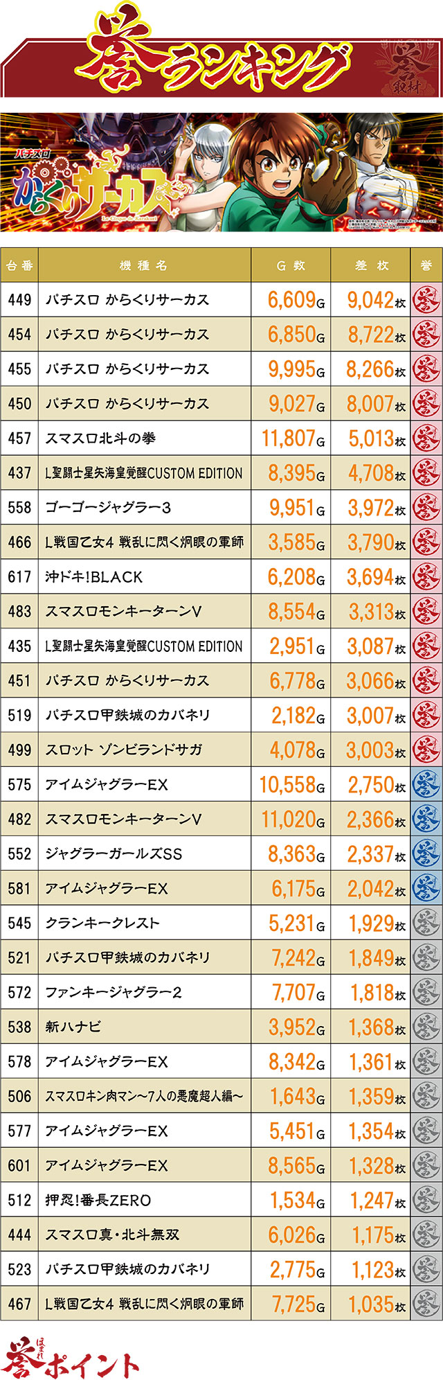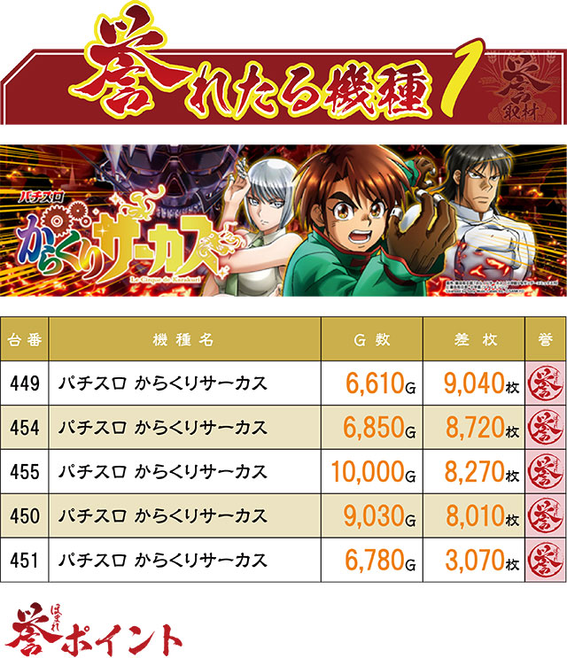 なんとこの日の誉ランキングのTOP4記録を『パチスロ からくりサーカス』が独占!4台ともが8,000枚オーバーという常識外れの結果だった。その他、さまざまな機種から誉レコードが生まれたものの、『からくり』以上のインパクトを残した台はなかったようだ。