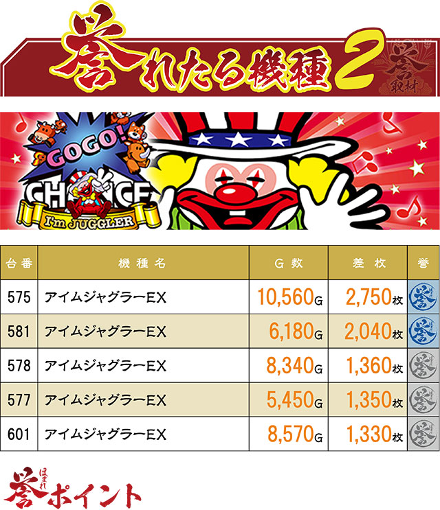 『アイムジャグラーEX』からは5台の誉マーク出現。残念ながら赤誉マークには届かなかったが、どの台も安定してGOGOランプをペカらせ、常連ユーザーを満足させていた様子。