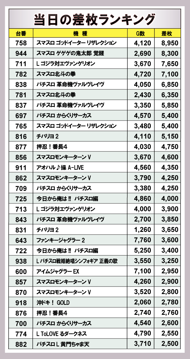 この日は残念ながら万枚OVER台は発生しなかったが、『スマスロ ゴッドイーター リザレクション』『スマスロ ゲゲゲの鬼太郎 覚醒』で+8,000枚OVERを筆頭に、『L ゴジラ対エヴァンゲリオン』『スマスロ北斗の拳』では+7,000枚OVERをマーク!まとまった出玉を獲得する台が多く、遊技するファンは相当な手応えを掴んでいたことだろう。