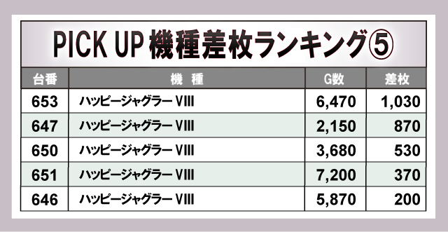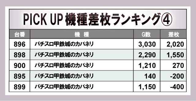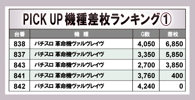 『パチスロ 革命機ヴァルヴレイヴ』は高い活気を披露していたのが上表から窺える。スマスロ機はもちろん、『パチスロ甲鉄城のカバネリ』『ハッピージャグラーVⅢ』 といったメダル機も4桁OVER台が存在しており、しっかりと期待に応えていたと言えるだろう。