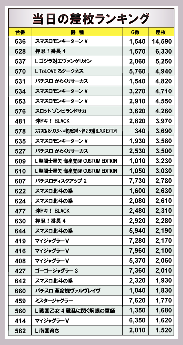 『スマスロモンキーターンV』にて万枚OVERが発生。それに続くのが『押忍!番長4』の6,000枚OVERと『L ゴジラ対エヴァンゲリオン』の5,000枚OVER。ほかにも様々な箇所から熱気が放たれており、館内全体が大いに盛り上がった1日になった。
