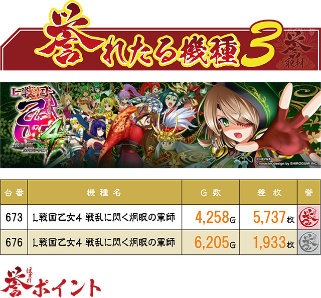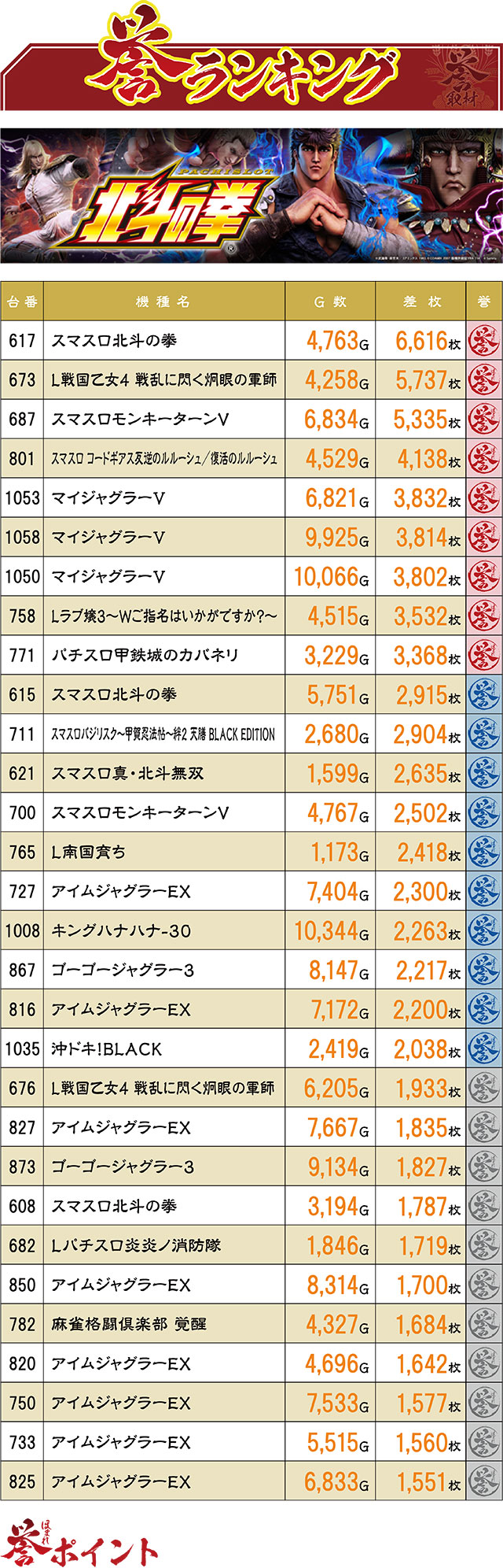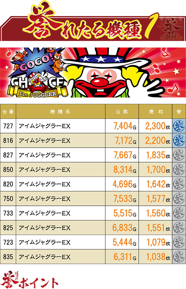 この日の最高差枚レコードを生み出したのは『スマスロ北斗の拳』。その後には『L戦国乙女4 戦乱に閃く炯眼の軍師』『スマスロモンキーターンV』など、おなじみの機種が並ぶ。そんな誉ランキングの中で、ひときわ目を引いたのは『ジャグラー』シリーズのランクイン台数の多さ。特に5~7位に連続ランクインを果たした『マイジャグラーⅤ』、そして計8台がランクインした『アイムジャグラーEX』の存在感が際立っていた!