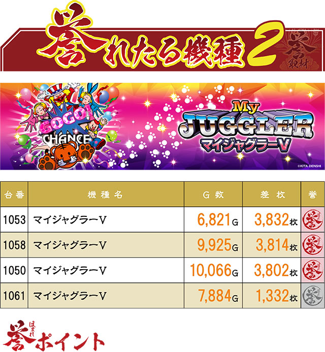3,000枚オーバー記録が3台も誕生するとは、さすがは『マイジャグラーⅤ』。しかもこの3台の記録がこの日の誉ランキングの5・6・7位に連続ランクイン!