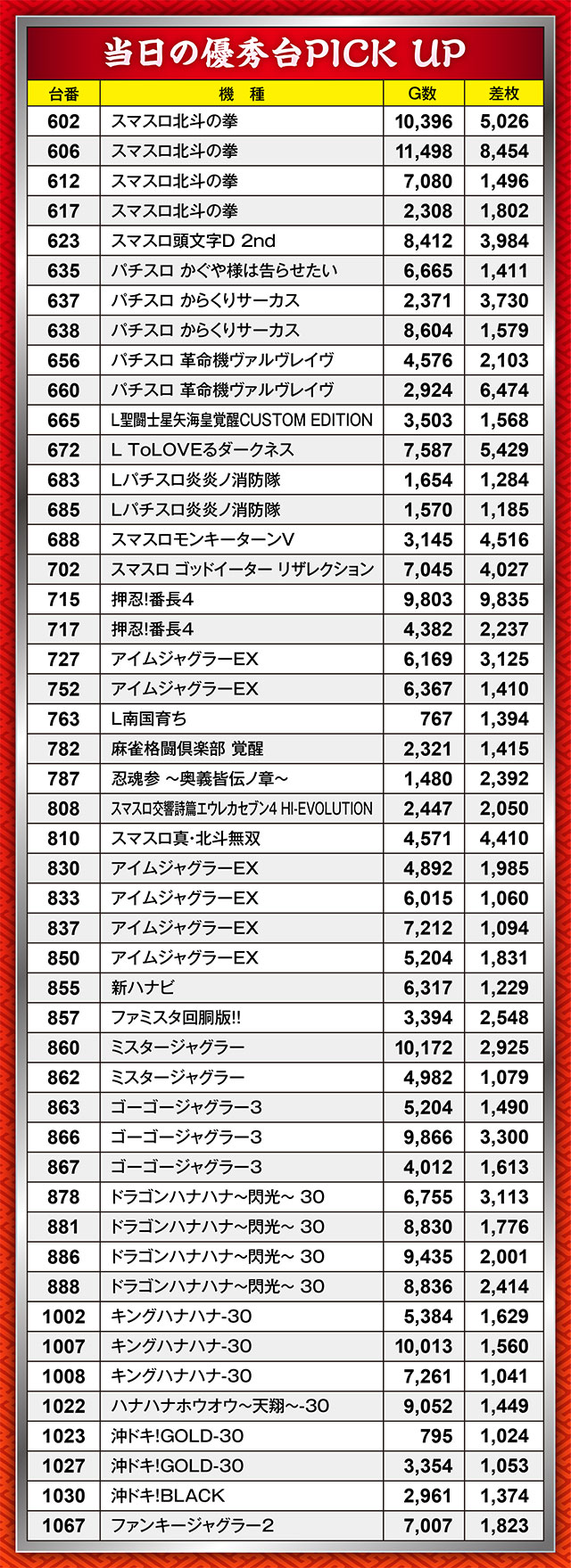 今回は10,000枚を上回る結果には出会えず…。それでも数多くの台から好挙動が飛び出し、プラス台を量産することとなった。名だたる人気マシンからは当たり前のように複数のプラス結果が生まれていた…!