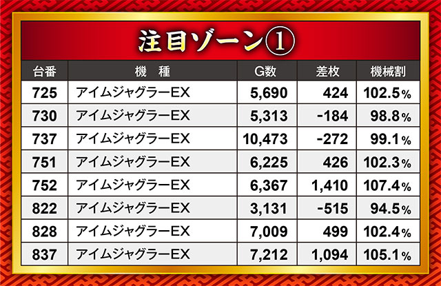 毎回良好な結果を残す『ジャグラー』シリーズだが、この日の『アイムジャグラーEX』は低空飛行のまま。プラス台はそれなりの台数あったものの、2,000枚を上回る結果は少なかった。