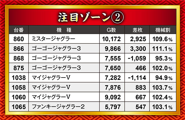 『アイムジャグラーEX』よりも目に見えて好調だったのが『ミスタージャグラー』&『ゴーゴージャグラー3』。両者から2,500枚を超える記録も生まれており、やはり21決戦取材の日は『ジャグラー』シリーズに注視すべきだと改めて教えてくれた。
