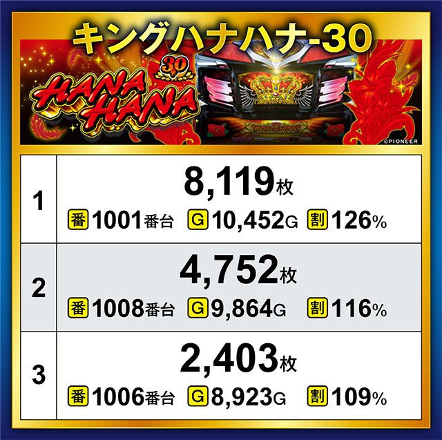 なんと、この日の最高差枚を記録したのは、まさかの伏兵『キングハナハナ-30』だった!それも8,000枚オーバーという信じがたい記録。前回、10,000枚超え記録に立った『Lパチスロ炎炎ノ消防隊』も健闘したが、1位・4位・7位・9位の座をハナハナ勢に譲る形となった。