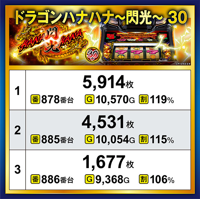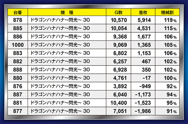 半数以上がプラス差枚をマークした上、878番台が6,000枚近くを吐き出した『ドラゴンハナハナ~閃光~ 30』。10,000G以上回された2台はブン回された結果、そろって4,500枚オーバーを達成することとなった。