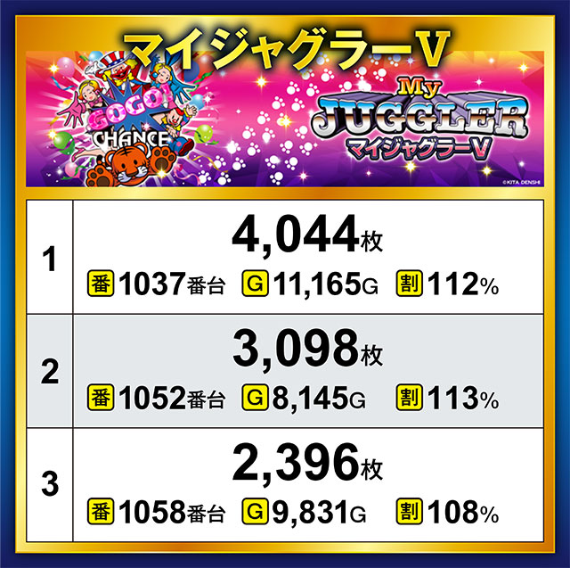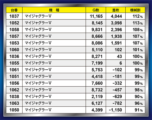 何気に『マイジャグラーⅤ』からも好記録が多発!半数以上の台がプラっていたのはもちろんのこと、1037番台&1052番台が3,000枚超えを達成した。