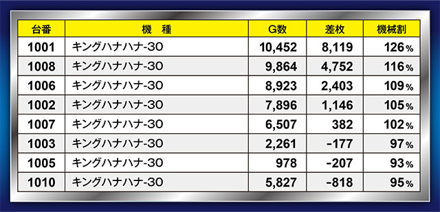 こちらも半数以上がプラっていた『キングハナハナ-30』。もちろん注目はAT機顔負けの結果を残した1001番台だろう。ハイビスカスランプが絶え間なくチカっていた様は、文字通り「キング」の名に相応しい貫禄だった。