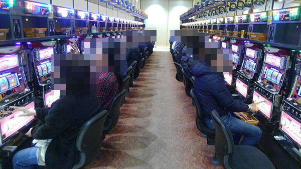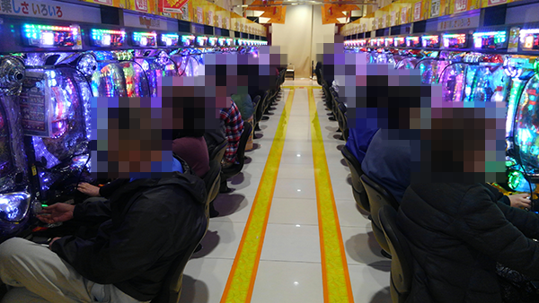 赤色に彩られた外観も特徴的なホールでは、多くのプレイヤーが遊技を楽しんでいた。