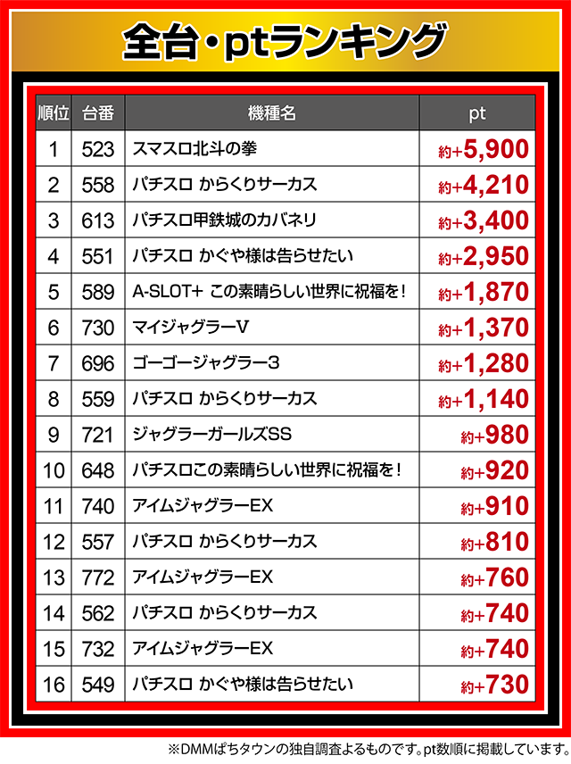 ボーナスが軸となる機種も盛況で、『マイジャグラーⅤ』の730番台が約+1,370pt。