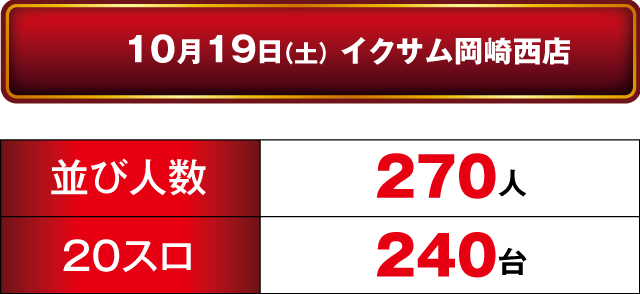 10月19日、「イクサム岡崎西店」で「EXA BURST」が開催された。この日は朝から20スロの設置台数を上回る270人のファンが集まり大賑わいで開店を迎えていたが、はたして店内ではどのような盛り上がりを見せたのか? 詳細なデータとともに徹底的にレポートしていこう。