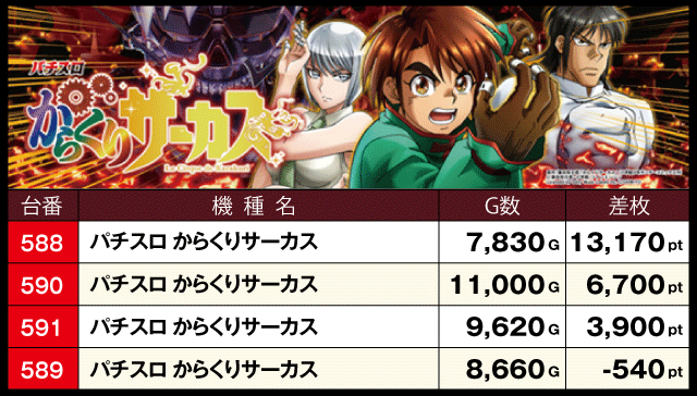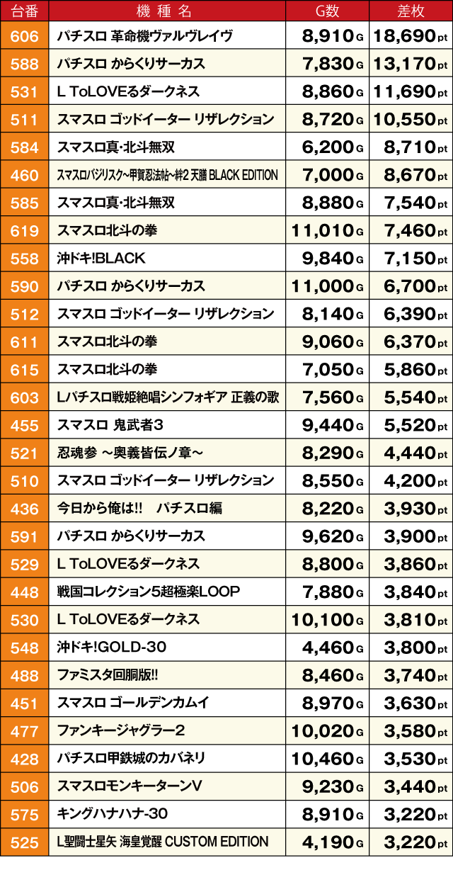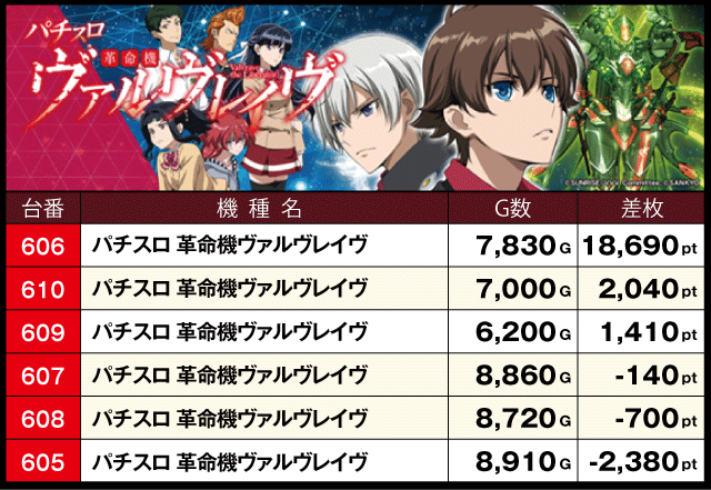 次に、ベスト3になった優秀機種の詳細をチェックしてみると、『パチスロ からくりサーカス』は4台中3台がプラス域で終了。『パチスロ 革命機ヴァルヴレイヴ』では圧巻の+18,690枚を叩き出している。