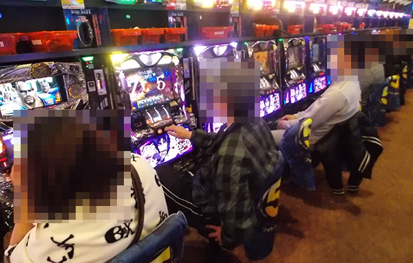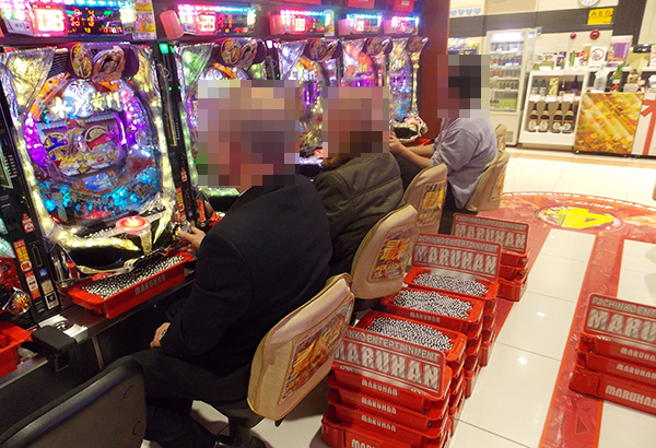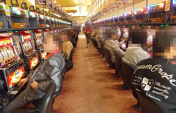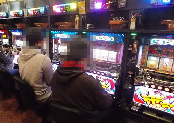 16時をまわった頃の20円パチスロでは、ジャグラーシリーズが人気。遊技を楽しむプレイヤーの姿からは、充実した時間を過ごせていることもうかがえた。