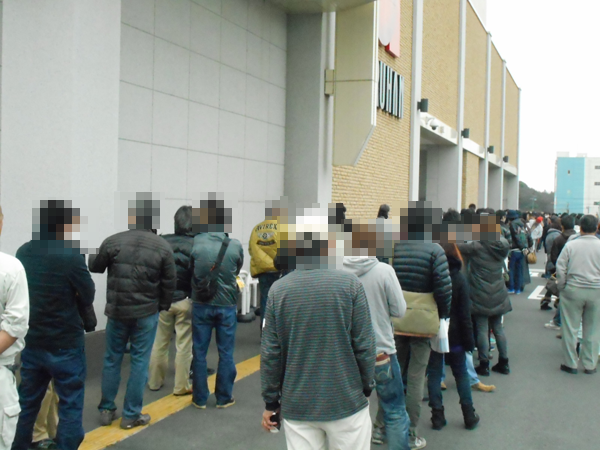 この日は開店時間が通常とは変わっており9時30分からのオープンで、9時から入場抽選が開始。パチンコとパチスロで別々に抽選が行われ、あわせて140人以上が集まった。一般入場者も100人を超え、悪天候ではあったものの大勢のプレイヤーに注目されていた。