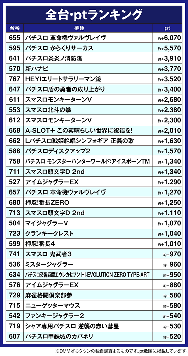 「パチスロ炎炎ノ消防隊」の641番台や「新ハナビ」の570番台なども約+3,000ptを超えた。