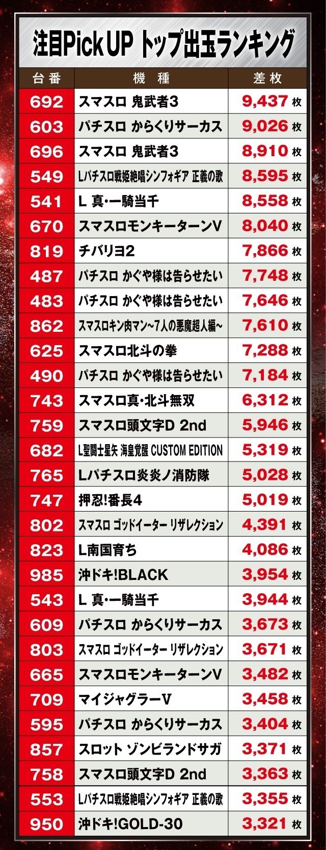 また、その他の機種を見てみると『パチスロ からくりサーカス』がトップと僅差の+9,026枚を記録。さらに『パチスロ かぐや様は告らせたい』では+7,000枚超が3台も発生する盛況ぶりにファンも大満足だったに違いない。