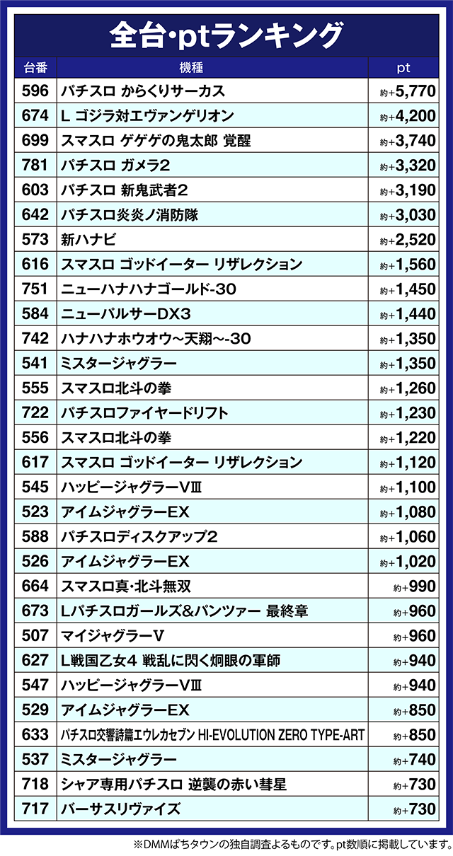 「スマスロ ゲゲゲの鬼太郎 覚醒」の699番台や「パチスロ ガメラ2」の781番台なども約+3,000pt以上と、いくつもの台が結果を残した。