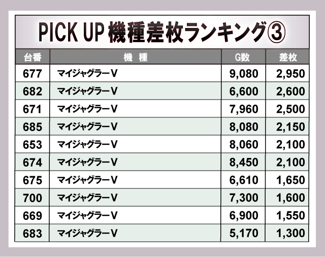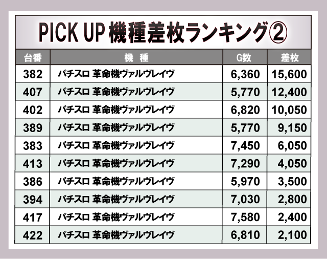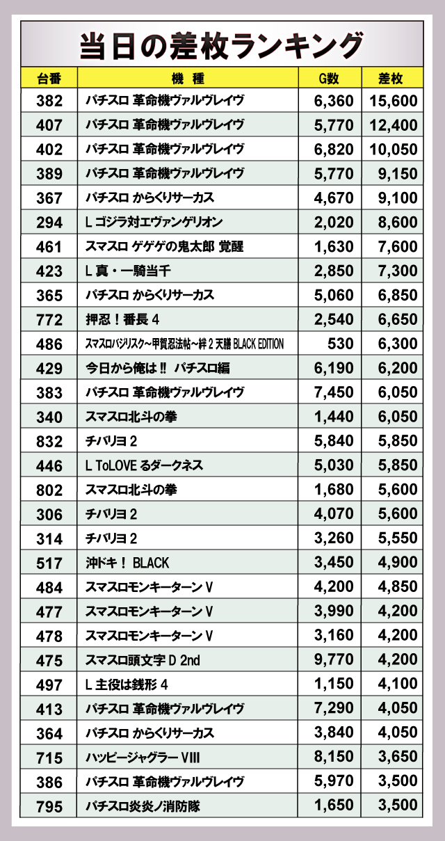 『パチスロ 革命機ヴァルヴレイヴ』から3台万枚OVERが発生し、店内の盛り上がりをリードしていた。『パチスロ からくりサーカス』は、+9,000枚OVERをマーク。また上表をご覧の通り、名を連ねているのは+3,000枚OVERからとなっており、想像以上の熱気に包まれていたかもしれない。同店の高い実力が窺えるばかりで、遊技していたファンは打ちごたえのある状況に歓喜したことだろう。