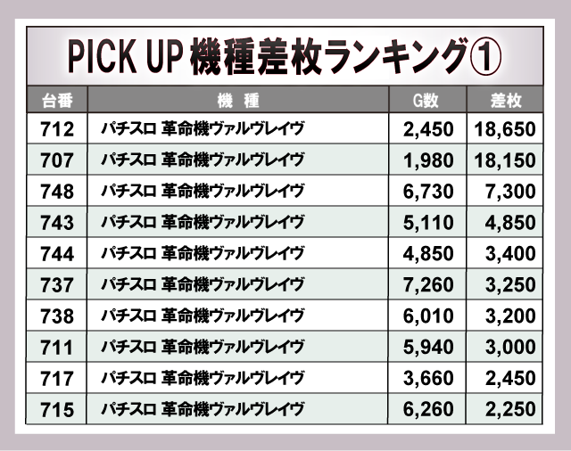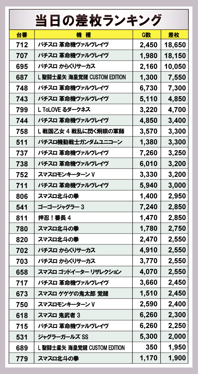 なんと万枚OVERが3台発生という結果は圧巻で、館内は凄まじい熱気に包まれていたことが分かる。またTOP30台は+1,900枚OVERからとなっていることも館内の熱量を窺える内容となっており、ファンは至福のひと時を過ごしていたことだろう。