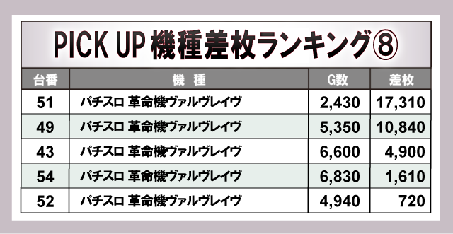 当日とくに店内を盛り上げた機種は上表の8機種。『スマスロモンキーターンV』『パチスロからくりサーカス』『パチスロ 革命機ヴァルヴレイヴ』では万枚OVERが発生。また、『パチスロ甲鉄城のカバネリ』『アイムジャグラーEX』『マイジャグラーV』『ファンキージャグラー2』といったメダル機も奮闘しており、多種多様に幅広い機種でチャンスが隠されていたようだ。
