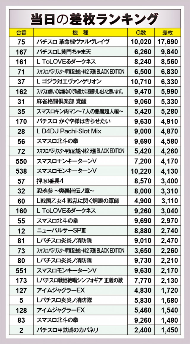 『パチスロ 革命機ヴァルヴレイヴ』75番台+17,690枚と凄まじい熱気が放たれ、店内の盛り上がりをリードする存在となっていた。また『パチスロL黄門ちゃま天』が9,000枚OVERと続いており、あわや万枚を達成という熱量を披露。『L ゴジラ対エヴァンゲリオン』『スマスロモンキーターンV』でも万回転OVERが発生しており、店内は活気と熱気に包まれていたと言える。
