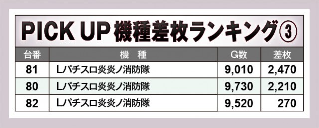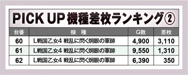 上表の優秀機種はいずれも高水準の盛り上がりを披露していたと言える。『スマスロバジリスク~甲賀忍法帖~絆2 天膳 BLACK EDITION』『L戦国乙女4 戦乱に閃く炯眼の軍師』『Lパチスロ炎炎ノ消防隊』が全台プラス差枚数を達成し、遊技していたファンは自信を持ってレバーを叩いていたはずだ。『L ToLOVEるダークネス』は惜しくも逃した格好ではあるが、8,000枚OVERと気を吐いており、やはり熱を帯びたエリアだったと言える。