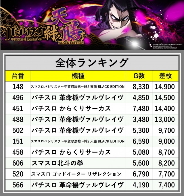 厳選された取材対象機種をはじめ、その他スロット全体から好記録が飛び出した!プレイヤーが楽しんだ1日を下記データにて振り返ってみて欲しい。