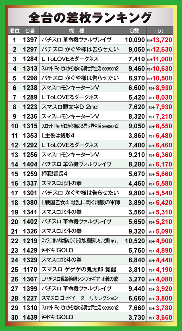 各店の全台差枚ランキング