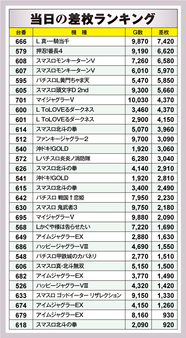 優秀台を見てみると、+7,420枚を記録した『L真・一騎当千』の666番台が、その名の恥じない活躍を見せてくれた。稼働も9,870Gをマークしており、今後も期待できそうだ。次いで+6,620枚だった『押忍!番長4』579番台。根強い人気にしっかり応えるのはさすがだ。『スマスロモンキーターンV』も負けてはいない。608番台が+6,580枚、607番台が+5,970枚を記録。今、一番勢いを感じる機種だ。さらに人気シリーズの新機種2つが続く。『パチスロL黄門ちゃま 天』は595番台が+5,850枚、『スマスロ頭文字D 2nd』は605番台が+5,660枚をそれぞれマークした。最新スマスロに混じって、『マイジャグラーⅤ』が活躍しているのも見逃せない。701番台が+4,370枚を記録。また、同台はG数も10,030Gに達しており、稼働の良さが台の優秀さを物語っているといえよう。