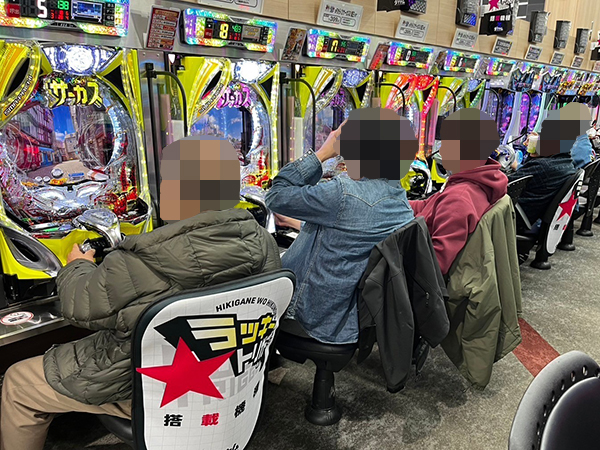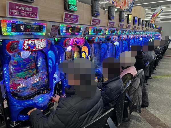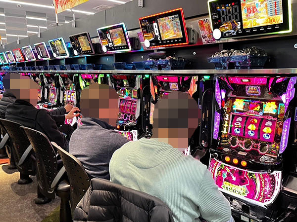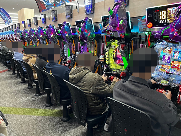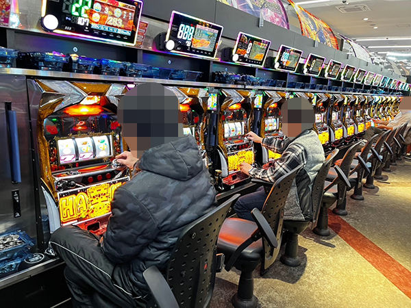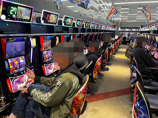 取材時は多くのプレイヤーが来店。パチンコ・パチスロともに、様々な機種が支持を得ていた。