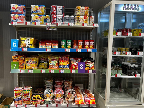 景品コーナーにはお菓子・インスタント食品・酒類など多彩なアイテムが揃っており、プレイヤーたちの目を引いていた。
