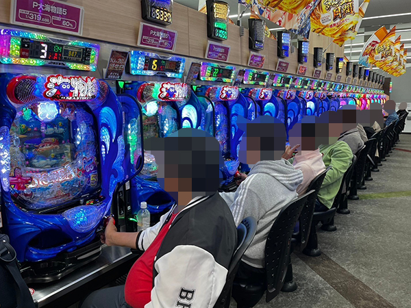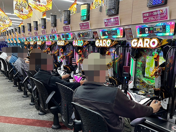 15時半ごろの4円パチンコでは「P大海物語5」や「P牙狼11〜冴島大河〜XX」が活況。プレイヤーの活躍をあちこちで目にしている。