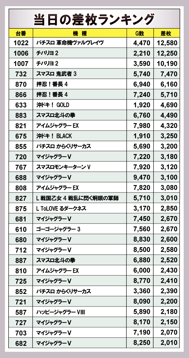 『パチスロ 革命機ヴァルヴレイヴ』『チバリヨ2』から万枚OVERが発生した。これらの熱気に引っ張られるようにして、各所にてまとまった出玉を獲得する台が多発。なんと上位30台の全てが+2,000枚OVER。様々な機種が大きな熱気を放ち、終日を通して打ち込まれた印象だ。