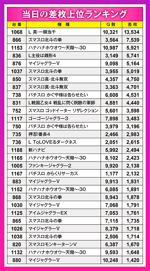 この日の最高差枚レコードを勝ち取ったのは、意外な機種『L 新・一騎当千』だった。数あるメイン機種を退け、13,000枚超えの偉業を成し遂げたのは、やはり優秀台の素質を兼ね備えていたからだろう。またこの日はAタイプがあり得ない底力を発揮し、『ハナハナホウオウ~天翔~-30』が6,000枚弱、『マイジャグラーⅤ』が5,000枚超えなどのスーパー結果を叩き出してくれた。