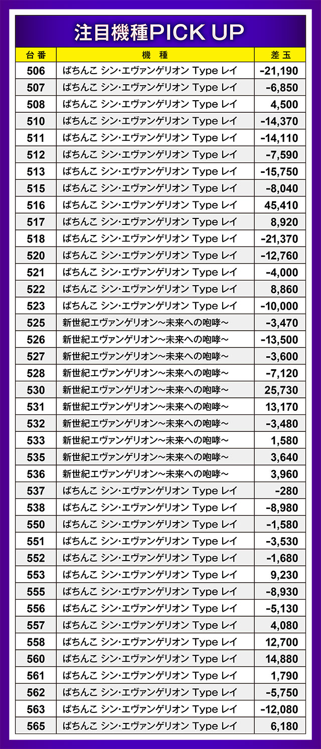 まさかの機種から13,000枚オーバー台が生まれるなど、サプライズだらけだった今回。『ハナハナホウオウ~天翔~-30』と『マイジャグラーⅤ』から生まれたとんでもない記録に驚かれた方も多かったことだろう。その反面、『北斗』シリーズと『ジャグラー』シリーズがTOP30に多くランクインを果たし、常連さん人気の高い台も好結果を残してくれた。また、パチンココーナーでは『エヴァンゲリオン』シリーズが堂々の存在感を放っていた!